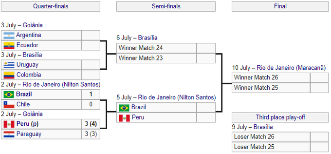 В полуфинале Бразилия сыграет против сборнойПеру, которая тремя часами ранее по пенальти переиграла Парагвай.