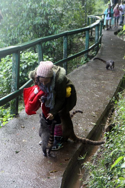До велетенських потоків можна підійти фактично впритул завдяки місточку, що кріпиться до землі якраз у тому місці, де починається прірва. Тож ви отримуєте можливість стояти там, де вода спадає просто в долину. Відчуття – незабутні! Як я уже згадував, води цього разу було дуже багато, а тому постояти на містку - все одно, що прийняти холодний душ! І я, і решта туристів за мить стали мокрими-мокрісінькими, однак така метаморфоза лише підсилила відчуття того, що ти наче сам побував у водоспаді і при цьому не впав додолу! А над нашими головами яскравими кольорами вигравала веселка!Ну де ще таке побачиш?! На зворотному шляху до автобусу єноти плуталися під ногами великими групками. Годувати їх заборонено, але вони й не просять: самі собі щось риють, до смітників намагаються залізти. І гуляють по асфальту – як ми по Хрещатику!